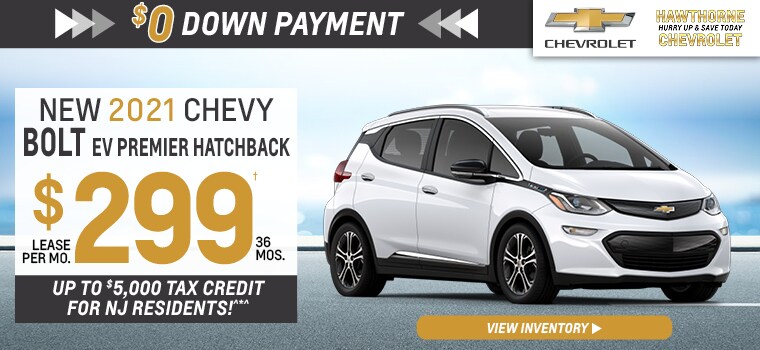 STK #212124. VIN #M4105134. 5 DR, 4 CYL, AUTO, FWD, MSRP $44,005. TOTAL PYMTS: $10,764. RESIDUAL: $22,882.60. $0 DOWN PYMT + FIRST MO. PYMNT + $0 SECURITY DEPOSIT + $695 BANK FEE = $994 DUE AT SIGNING. LEASE INCLUDES $5,000 GM FINANCIAL LEASE PROGRAM + $1,500 GM LEASE LOYALTY/CONQUEST PROGRAM^^ (CURRENT LESEES ONLY) + $5,000 CHARGE UP NJ PROGRAM + $1,500 CHEVY INC. CCR PROGRAM. ^*^MUST RESIDE IN NJ AND REMAIN LIVING IN NJ FOR AT LEAST 2 YEARS AFTER PURCHASE. SEE DEALER FOR COMPLETE DETAILS. PRICES INCLUDE ALL COSTS TO BE PAID BY CONSUMER, EXCEPT FOR LICENSING COSTS, REGISTRATION FEES, AND TAXES. CONSUMER RESPONSIBLE FOR DOC FEE OF $399. OFFERS SUBJECT TO PRIMARY LENDERS APPROVAL TO QUALIFIED BUYERS ON SELECT MODELS. SEE DEALER FOR DETAILS. †LEASE INCLUDES 10K MI/YR, .25¢ THEREAFTER. LESSEE IS RESPONSIBLE FOR MAINTENANCE AND EXCESS WEAR/TEAR. NOT ALL OFFERS AND REBATES CAN BE COMBINED. AD PRICES CANCEL/SUPERSEDE ALL PREVIOUS SALES/OFFERINGS. NOT ALL OFFERS AND REBATES CAN BE COMBINED. PHOTOS ARE FOR ILLUSTRATIVE PURPOSES ONLY. NOT RESPONSIBLE FOR TYPOGRAPHICAL ERRORS. OFFERS EXPIRE 8/31/21.
